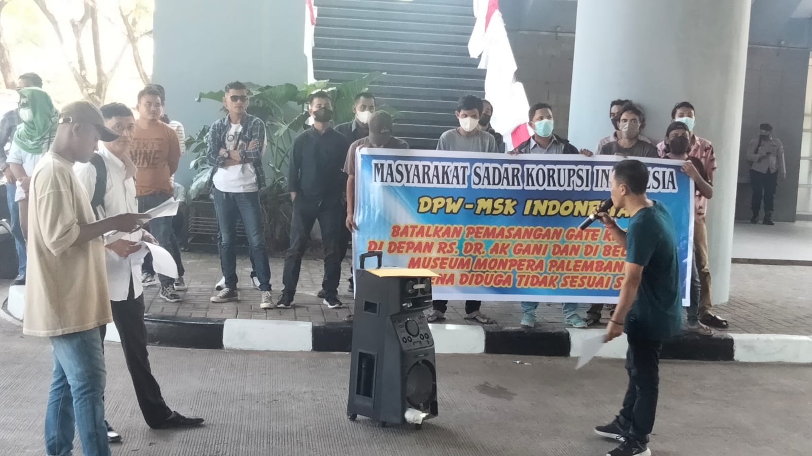 SUMSEL, SahabatRakyat.com- Puluhan massa yang tergabung dalam Dewan Pimpinan Wilayah Masyarakat Sadar Korupsi (DPW MSK) Indonesia provinsi Sumatera Selatan menggelar aksi unjuk rasa terkait polemik pemasangan gate parkir ditengah-tengah jalan di depan RS AK Gani Palembang.