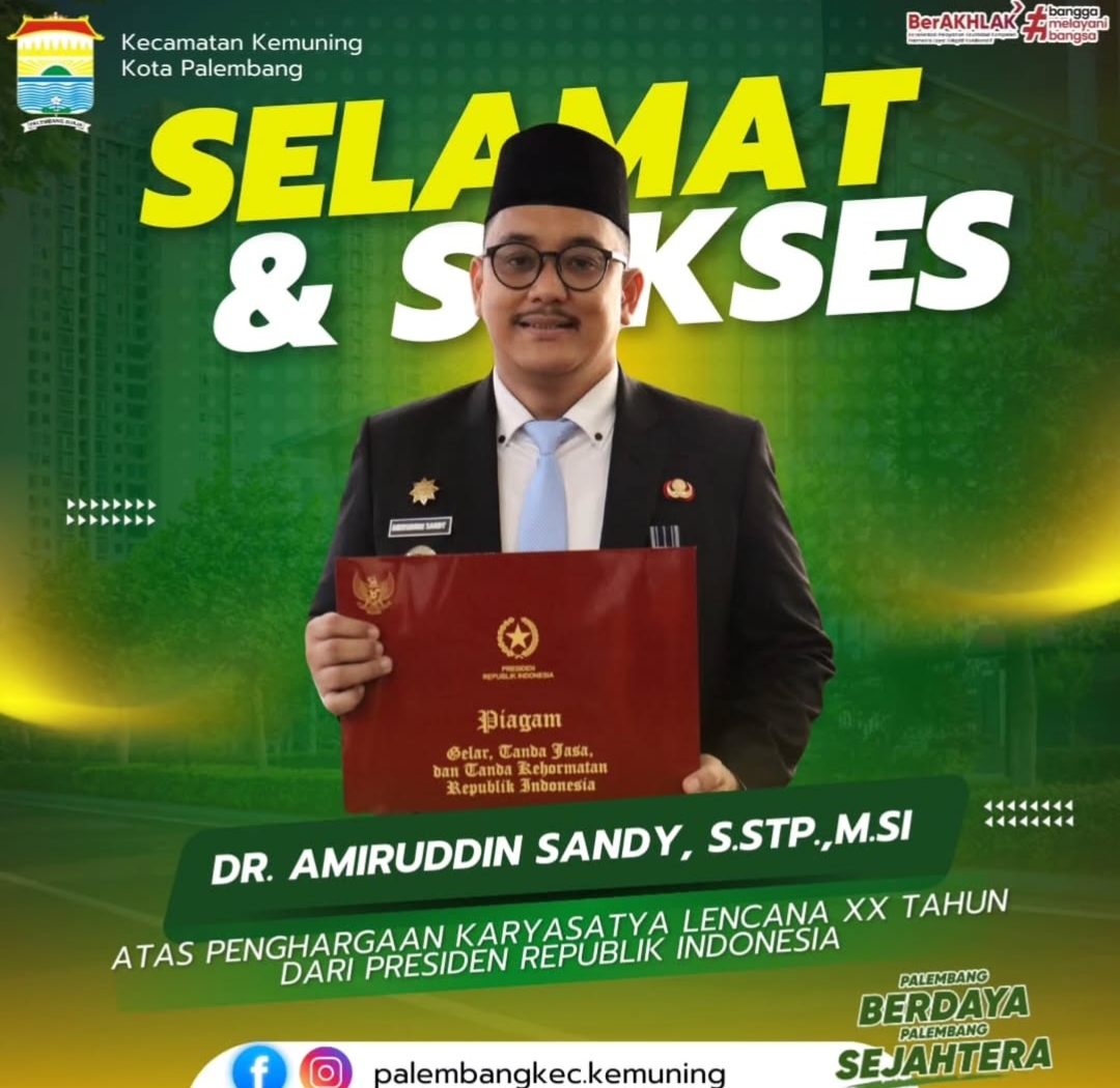Sumsel.Sahabatrakyat.com, Palembang – Camat Kemuning, Dr. Amiruddin Sandy, S.STP., M.Si, menerima penghargaan Karyasatya Lencana XX Tahun dari Presiden Republik Indonesia atas pengabdiannya selama 20 tahun sebagai Pegawai Negeri Sipil (PNS).