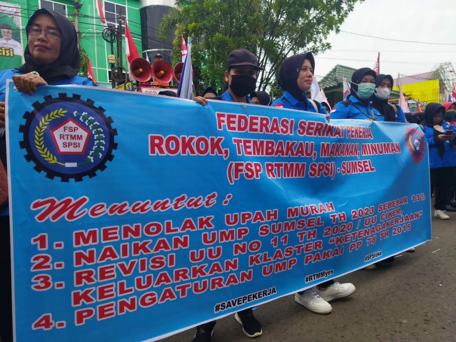 Aksi demo terkait permasalahan rekomendasi Dewan Pengupahan Provinsi (Deperprov) Sumatera Selatan kepada Gubernur Sumsel yang merekomendasikan kenaikan Upah Minimum Provinsi (UMP) Sumsel tahun 2023 yang hanya sebesar Rp 27.113 atau naik 0,86 persen.