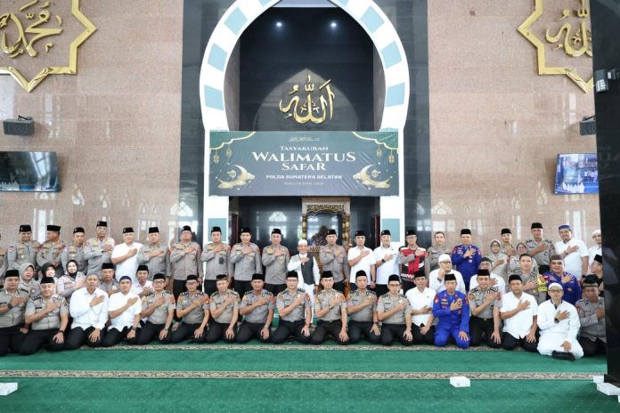 Sumsel.Sahabatrakyat.com, Palembang – Kapolda Sumatera Selatan Irjen Pol Dr. Sandi Nugroho, S.I.K., S.H., M.Hum. menegaskan bahwa penguatan mental spiritual merupakan fondasi utama dalam membentuk personel Polri yang profesional, berintegritas, dan humanis. Penegasan tersebut disampaikan saat memimpin kegiatan Tasyakuran Walimatussafar bagi keluarga besar Polda Sumsel yang akan menunaikan ibadah haji musim 1447 H / 2026 M di Masjid Assa’adah Mapolda Sumsel, Rabu (15/4/2026).