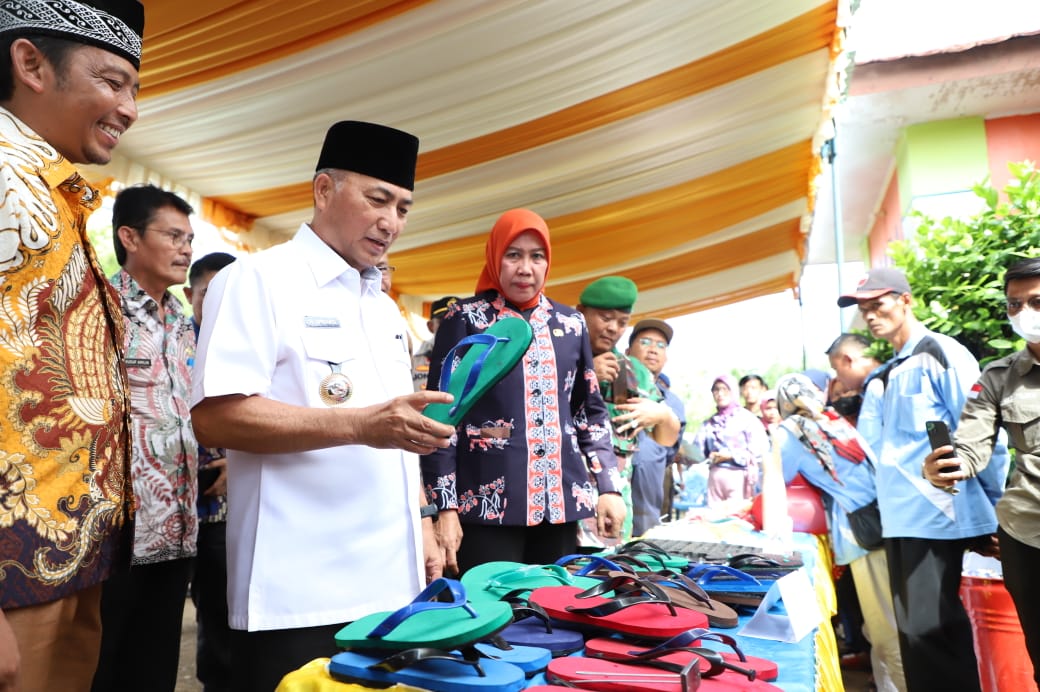 Pj Bupati Apriyadi meminta agar para masyarakat Plakat Tinggi yang sudah mendapatkan pelatihan pembuatan sandal jepit untuk membuat sebanyak seribu sandal.