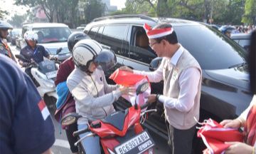 Lokasinya di simpang lima kantor DPRD Sumsel, Jumat (11/8/2023). Bendera dibagikan kepada pengendara yang melintas di simpang itu.